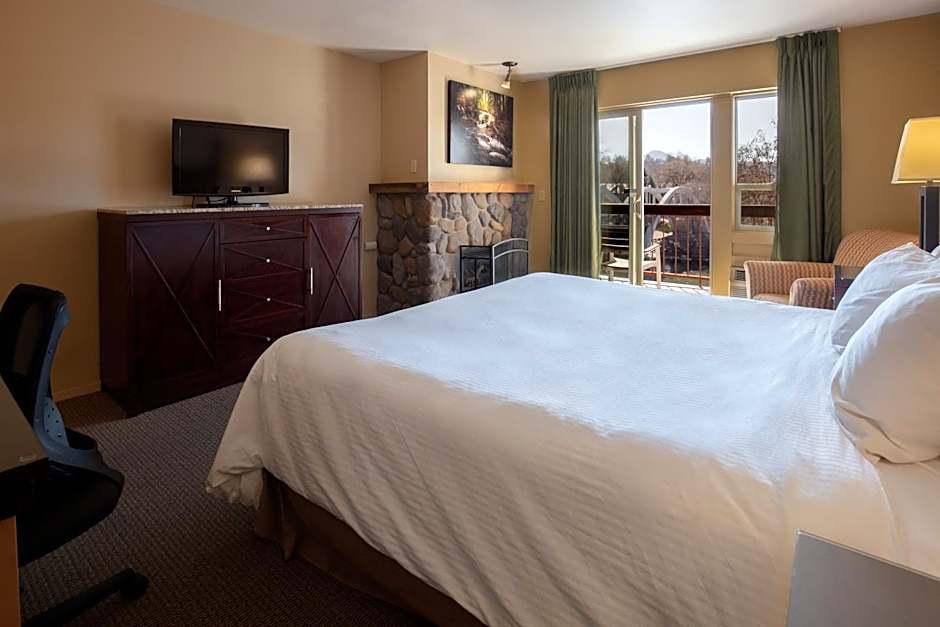 Third floor room features a river-rock fireplace, a flat-screen TV with cable channels, a desk, coffee-making facilities, an private bathroom with a hairdryer and a terrace overlooking the Rogue River.